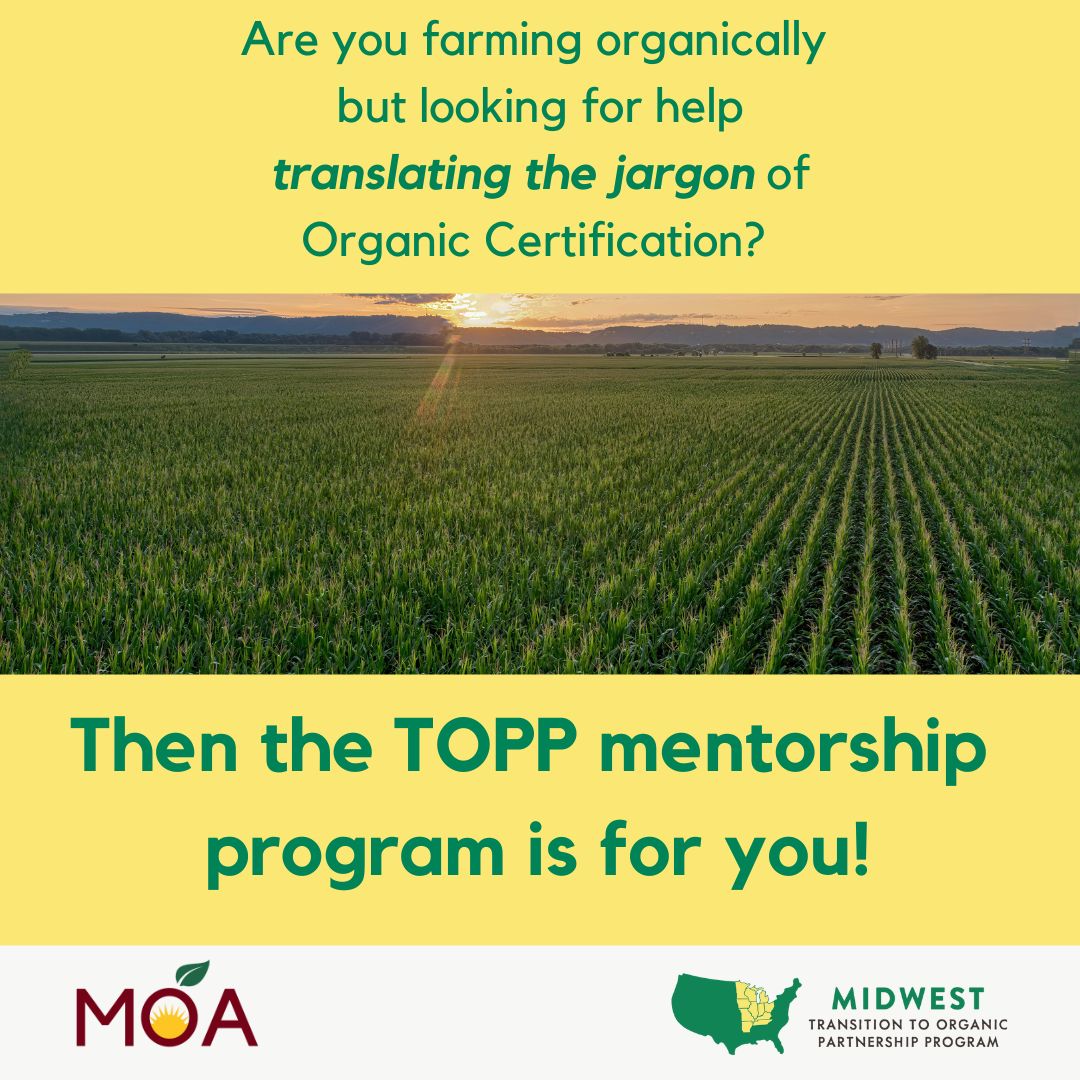 The Missouri Organic Association (MOA) has long been committed to helping farmers transition to organic production and supporting the growth of organic agriculture nationwide. One key way we’ve been able to expand this work is through the USDA’s Transition to Organic Partnership Program (TOPP). With TOPP funding, MOA has helped connect farmers with mentorship opportunities, created systems to support the transition process, and brought greater awareness to the organic label and practices.