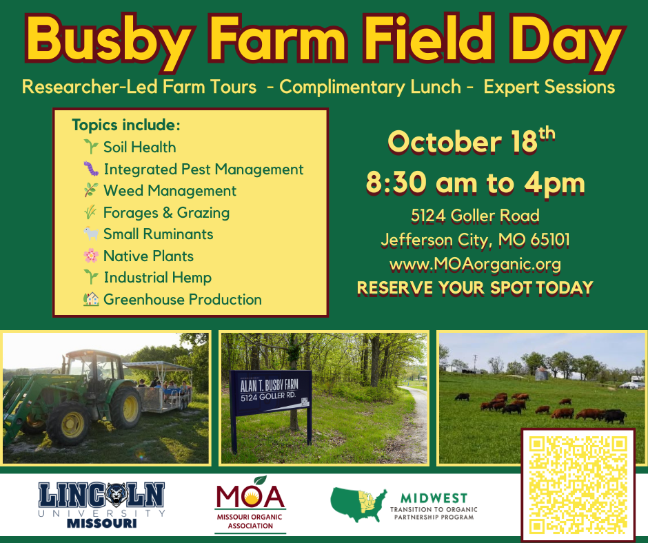 Join Missouri Organic Association (MOA) and Lincoln University for a dynamic, free Field Day at the Alan T. Busby Research Farm—an immersive day of farm tours, networking, and expert insights.