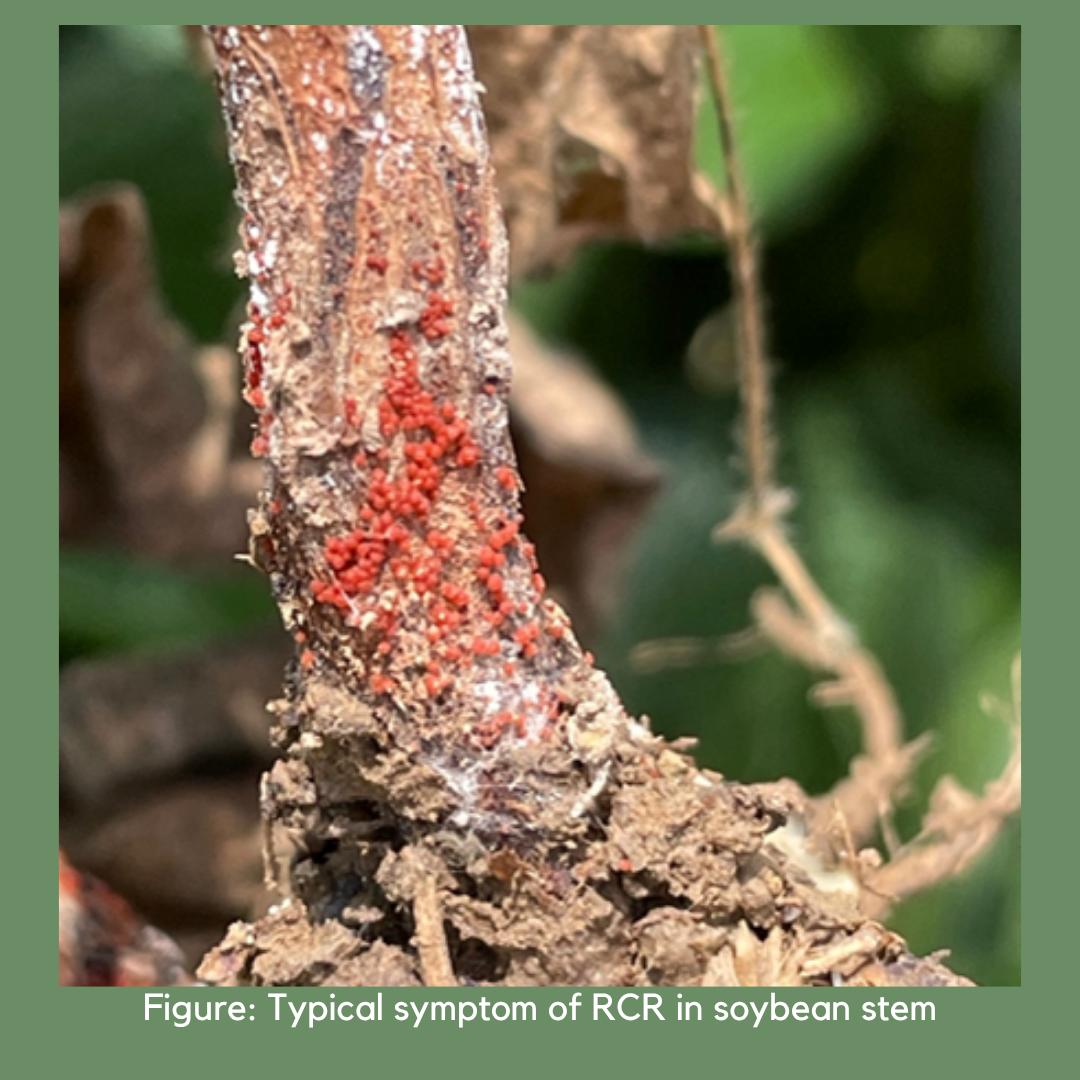 Red Crown Rot is a fungal disease primarily affecting soybean roots, lower stems and leaves. It causes: